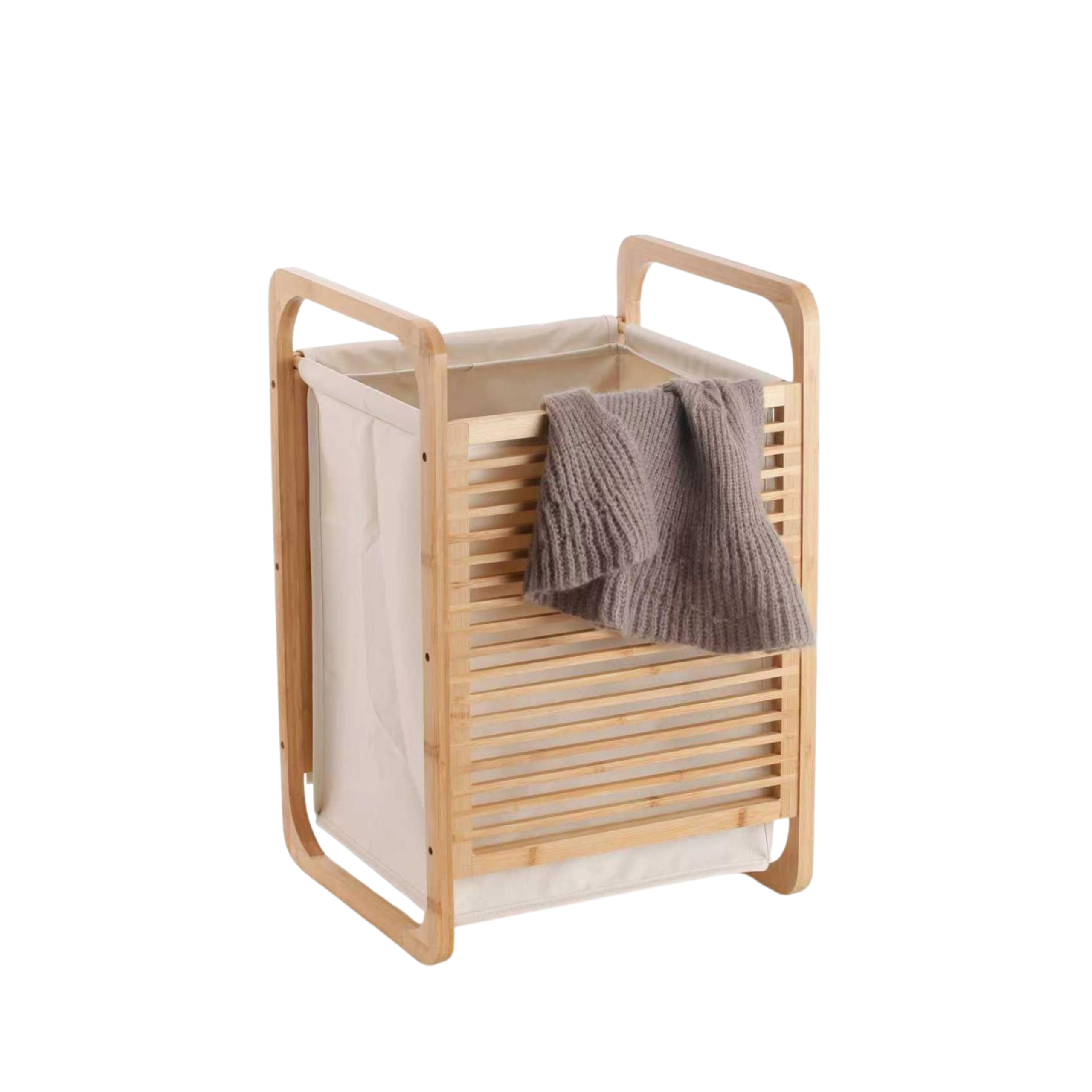 Este canasto de bambú está concebido como una pieza de diseño que combina funcionalidad y presencia dentro del espacio.