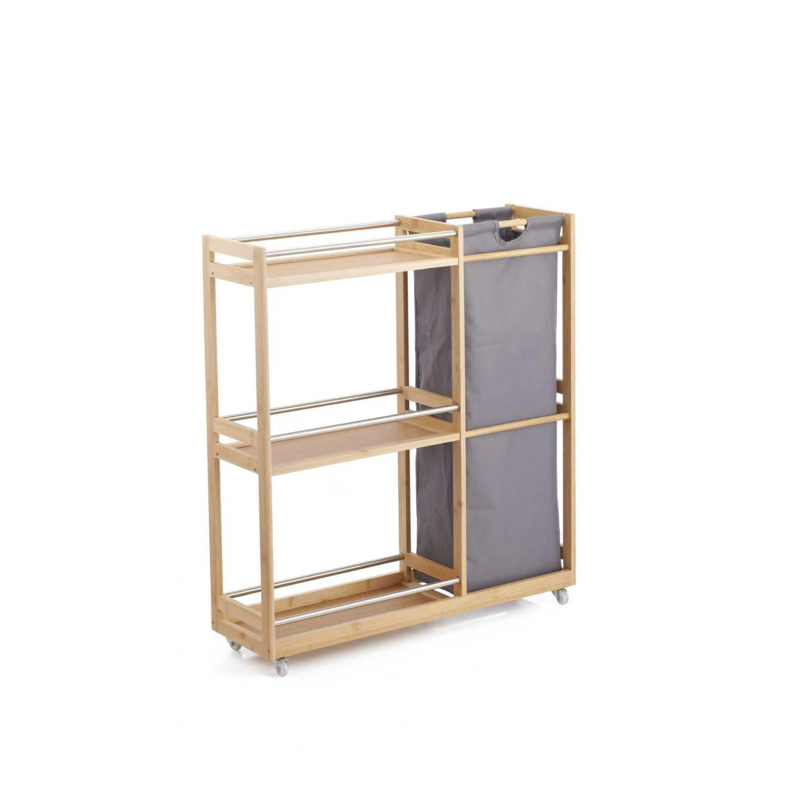 Carro organizador de bambú de 3 niveles con bolsa para ropa. Funcional y ideal para espacios reducidos.