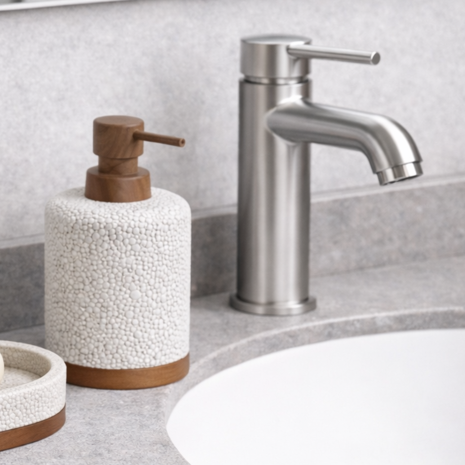 La excelencia en el interiorismo reside en la continuidad. Completá el set de baño con nuestro dispenser de resina de poliéster, diseñado bajo la misma estética que el resto de la colección.