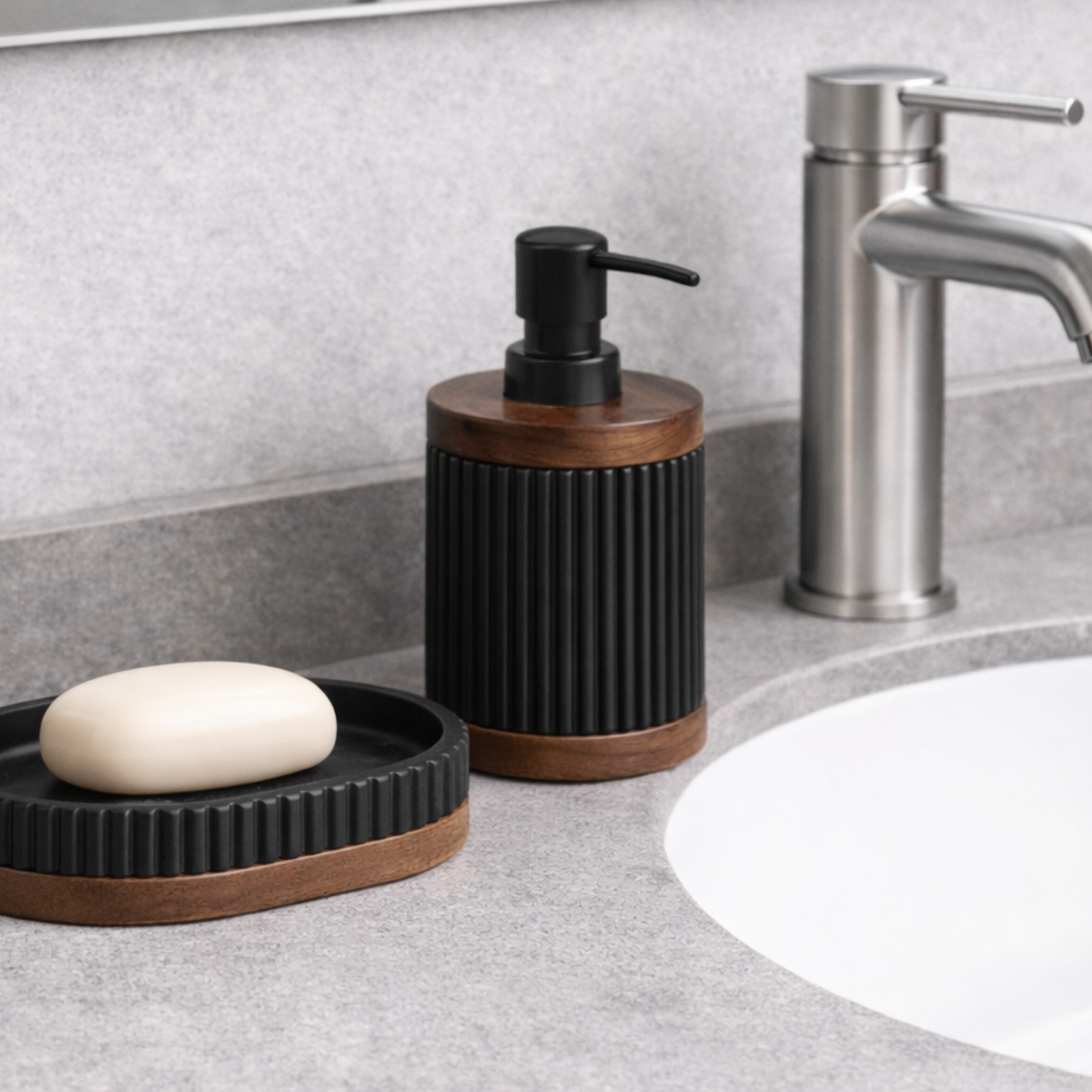 Este dispenser de jabón combina una estética oscura y uniforme con detalles en madera de acacia que aportan calidez y contraste al conjunto.