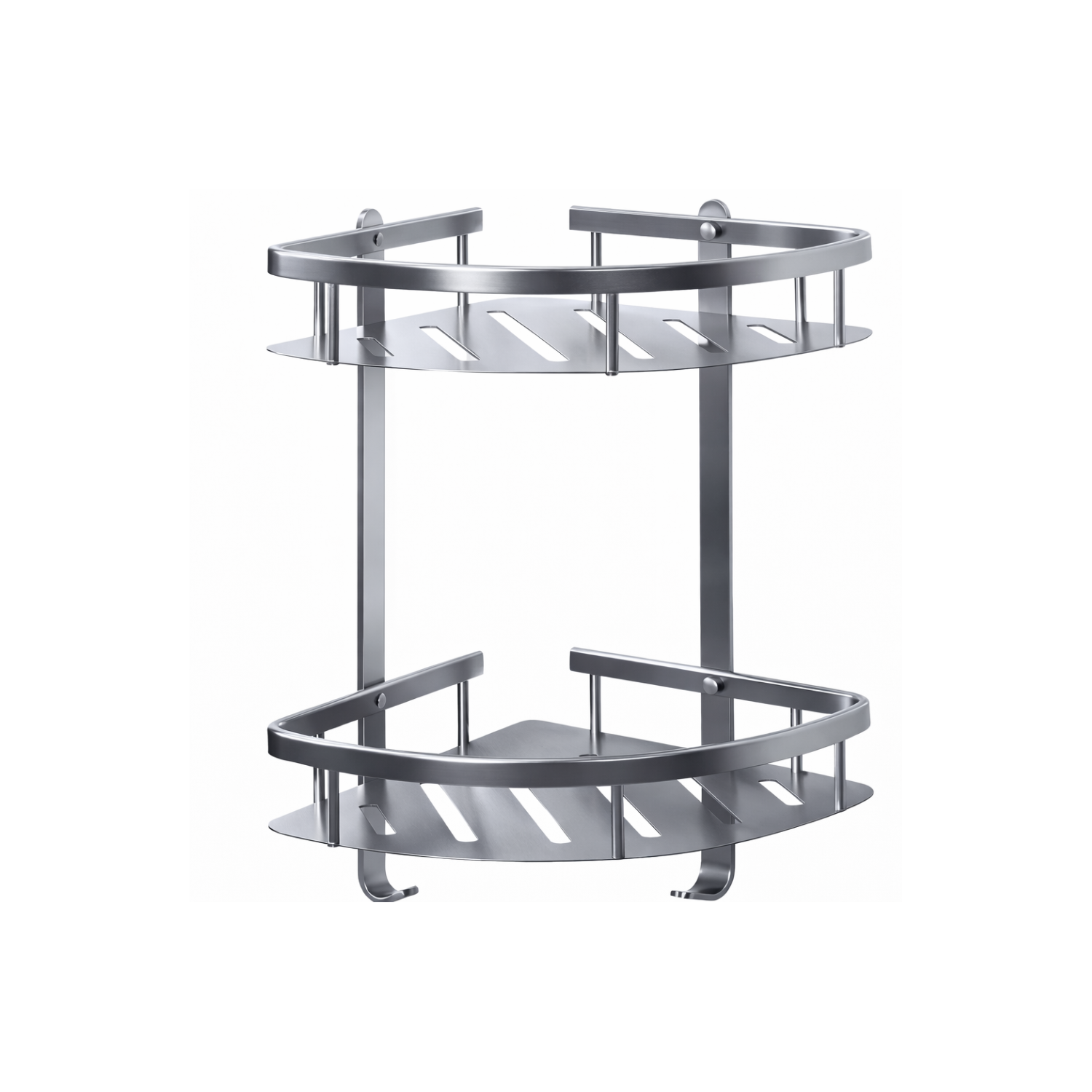 Este estante esquinero de aluminio doble está pensado para resolver el almacenamiento en zonas de ducha o baño sin ocupar espacio adicional. Su formato permite aprovechar las esquinas de manera eficiente, manteniendo los productos organizados y al alcance con dos niveles de estantes.