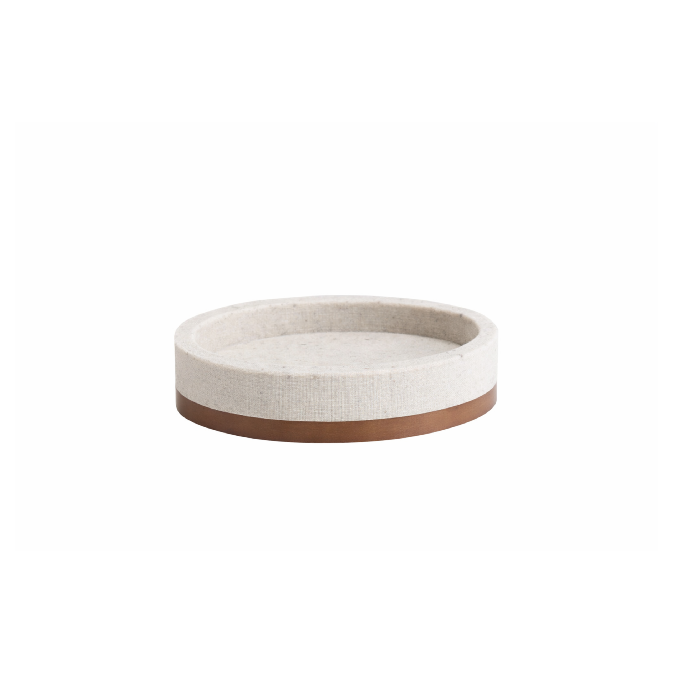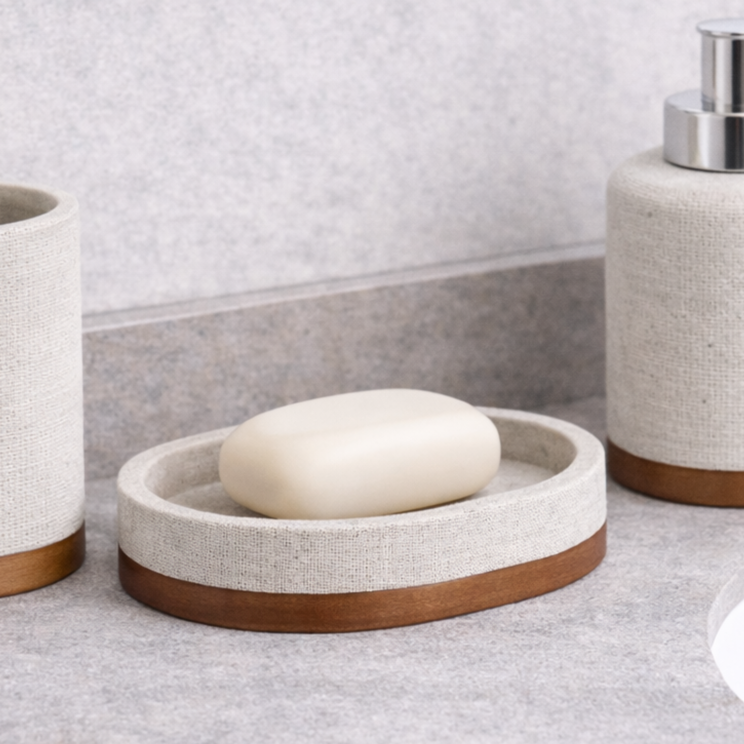Jabonera de poliresina arena clara con base de madera. Funcional y de estética natural.