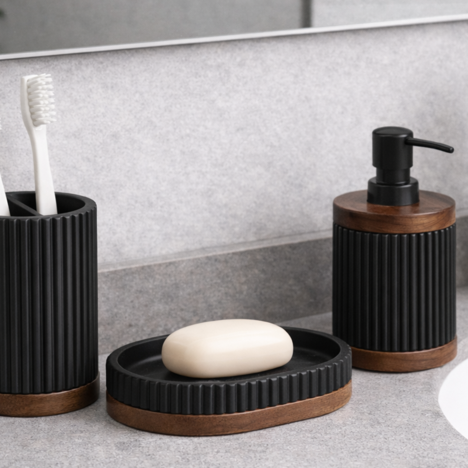 Esta jabonera de poliresina combina una estética oscura y uniforme con un detalle en madera de acacia en su base que aporta calidez y contraste al conjunto.