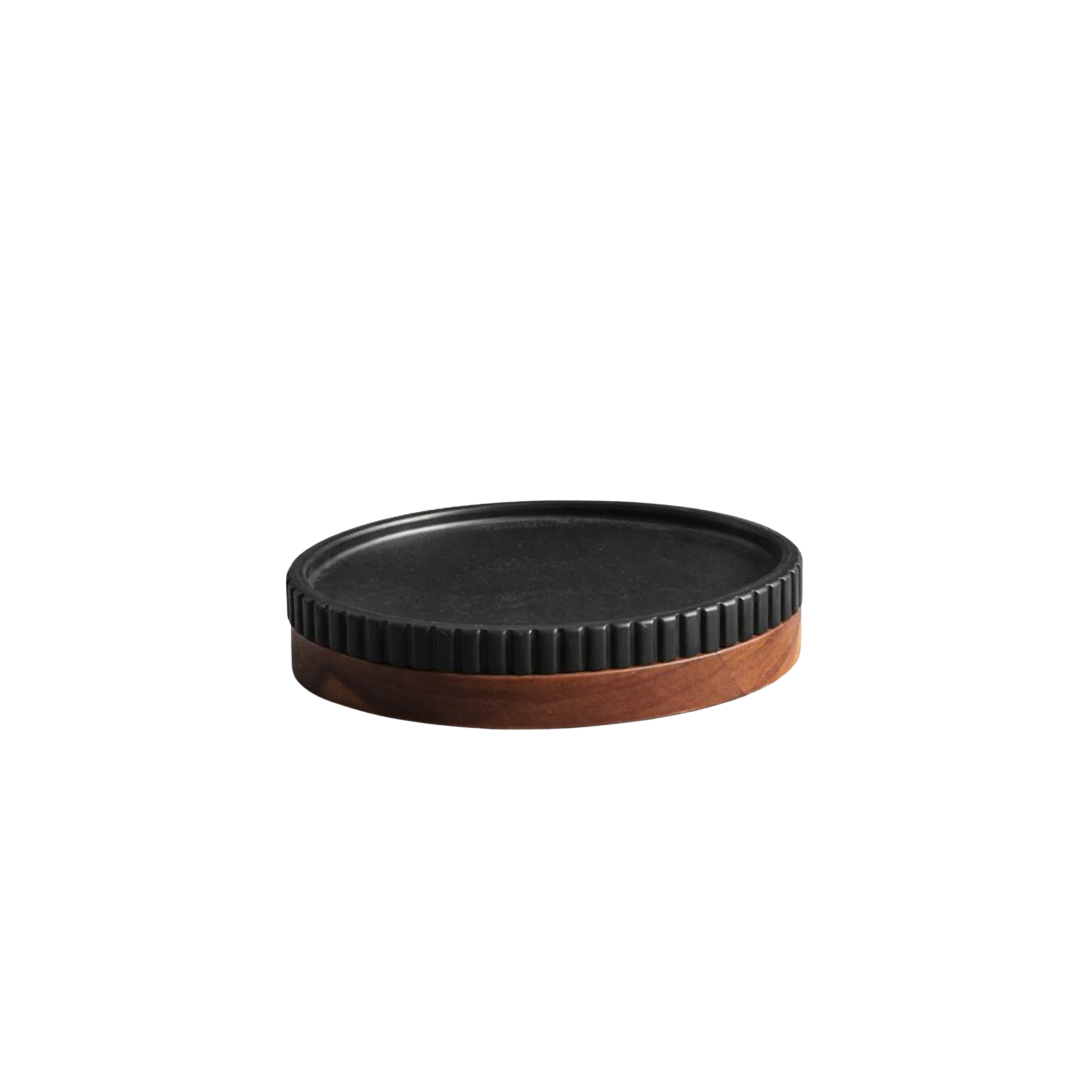 Jabonera de poliresina negra con base de madera. Funcional y de estética moderna.