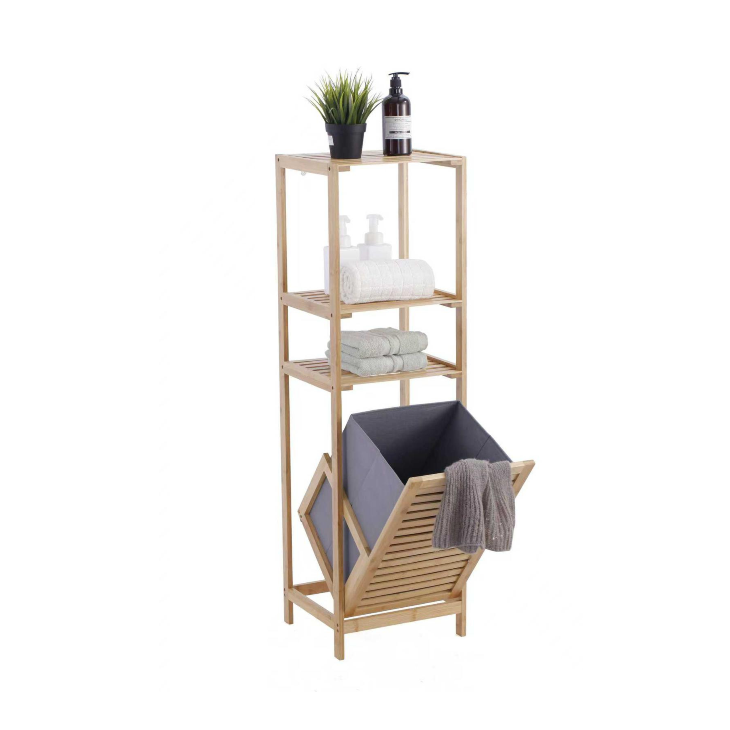 Organizador de bambú con cesto para ropa y 3 niveles de estantes