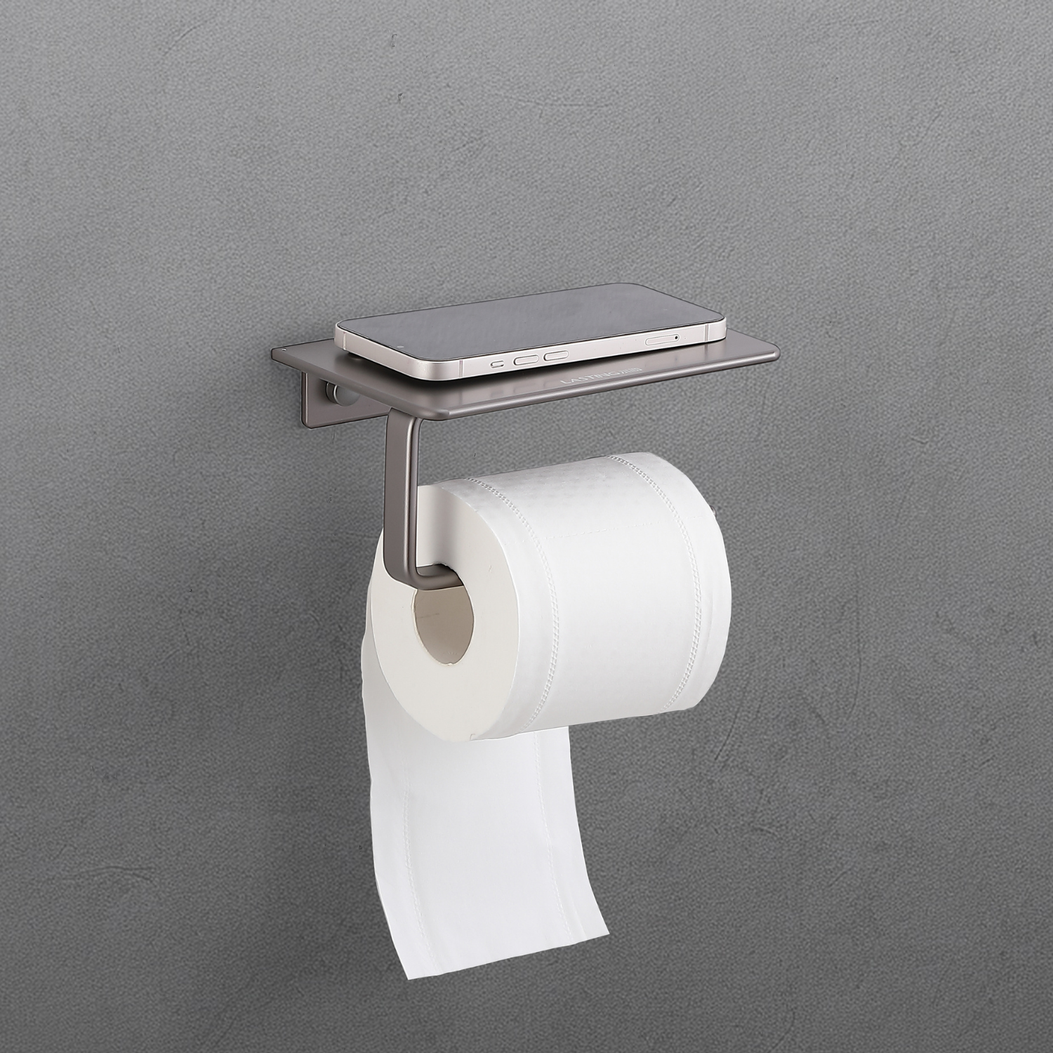 Este diseño combina un portarrollos de aluminio resistente con un práctico estante superior integrado, ideal para teléfono celular, artículos de higiene personal pequeños o adornos.