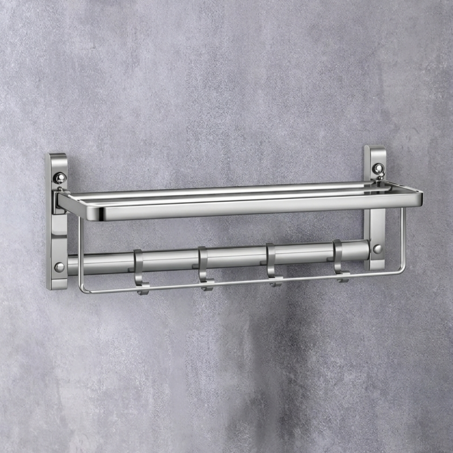 Diseñado para ofrecer mayor capacidad de organización en el baño, este toallero doble de aluminio incorpora barras paralelas para colgar toallas junto con ganchos inferiores que amplían su funcionalidad.