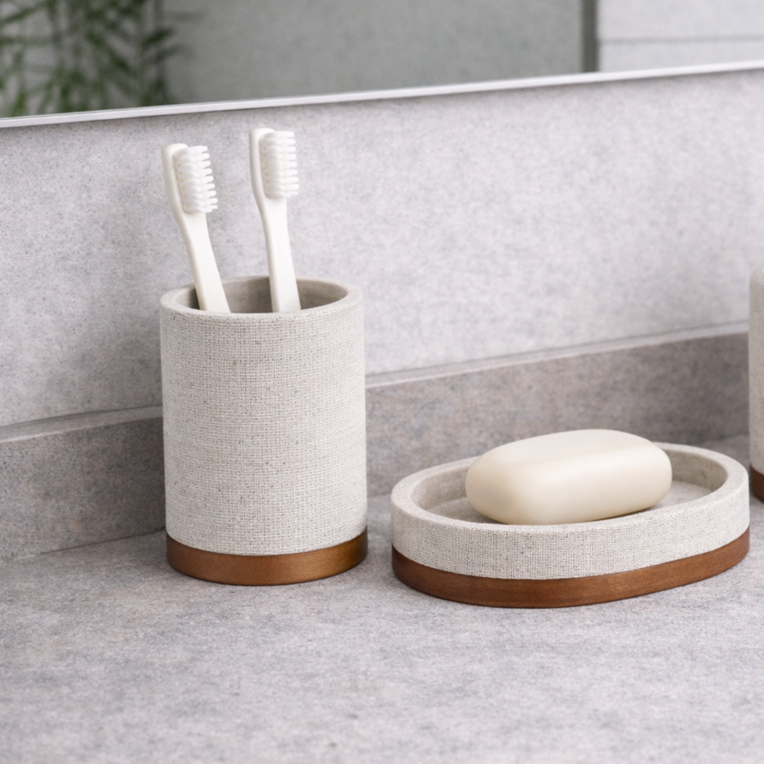Este vaso de poliresina combina materiales y texturas en una pieza pensada para aportar calidez y luminosidad al espacio del baño.