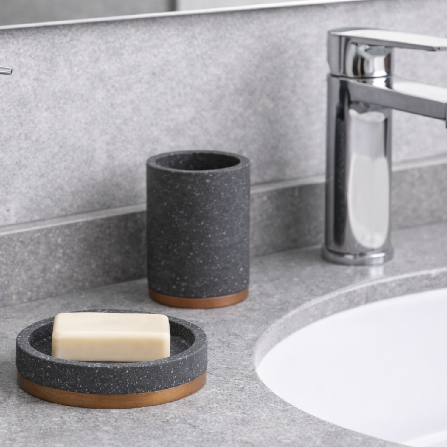 El acabado en arena negra aporta un aspecto mate y natural, mientras que la base de madera de acacia introduce un contraste orgánico que enriquece la estética del conjunto.